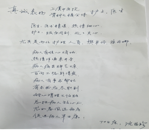 看到表揚(yáng)信的那一刻我感動了,8床的阿姨剛住院的時候,因為床位緊張放置在走廊的加床上,對我們諸多抱怨,認(rèn)為我們沒有合理安排好,在整個治療過程中,她和她的家屬因為手術(shù)接臺也提過意見,我一直以為這樣的病人,不理解我們的工作,但在出院的當(dāng)天,當(dāng)她把表揚(yáng)信送到我手上的那一刻,我知道,很多時候,我們誤解了彼此,其實很多時候我們沒有好好的學(xué)會傾聽跟溝通。