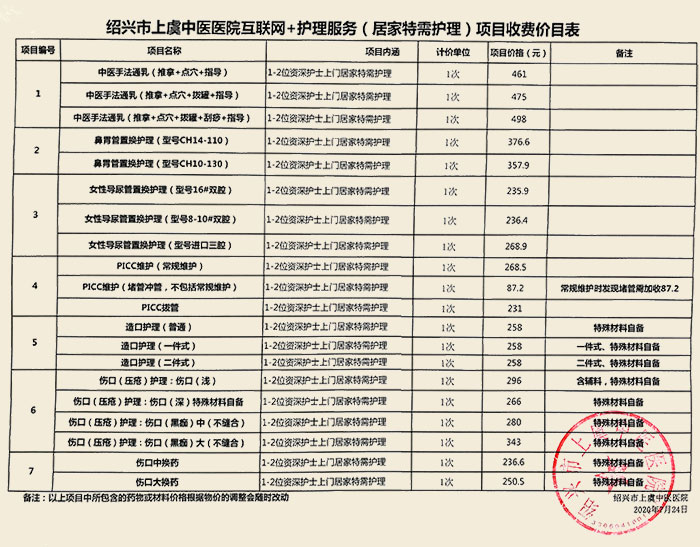 紹興市上虞中醫(yī)醫(yī)院互聯(lián)網(wǎng)+護理服務(wù)(居家特需護理)項目收費價目表