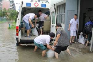 6月18日上午,由于連降大暴雨,我院出現(xiàn)大面積內(nèi)澇現(xiàn)象,暴雨將門診大樓、病房大樓和醫(yī)院入口完全隔開,醫(yī)院門診大樓內(nèi)的醫(yī)生只能和門口的患者“隔水相望”,地面積水高達(dá)20厘米以上。面對(duì)突如其來的洪水,醫(yī)院立即向上級(jí)部門報(bào)告災(zāi)情,迅速啟動(dòng)緊急防洪預(yù)案,院長(zhǎng)張龍君親自到災(zāi)情最緊急的配電房指揮,副市長(zhǎng)方靜、衛(wèi)生局局長(zhǎng)錢宏偉等領(lǐng)導(dǎo)第一時(shí)間趕到現(xiàn)場(chǎng),冒雨擬定排澇搶險(xiǎn)方案。