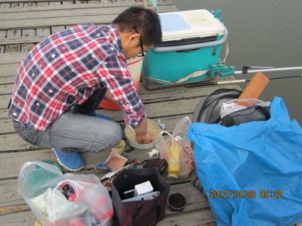 媽媽撒魚食,爸爸釣魚,女兒等著魚兒上鉤