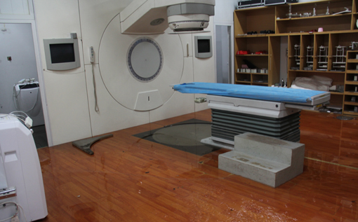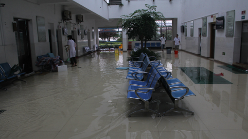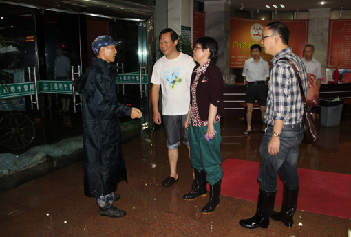 7日下午4時許,院內(nèi)積水高度已遠遠超過院內(nèi)部分建筑地面,醫(yī)院放療中心,消毒供應(yīng)室,門診大樓放射科、檢驗科、西藥房、輸液室等多處出現(xiàn)進水現(xiàn)象,市衛(wèi)生局錢宏偉局長、陸云斌副局長等相關(guān)領(lǐng)導前來我院查看內(nèi)澇情況并指導工作。
