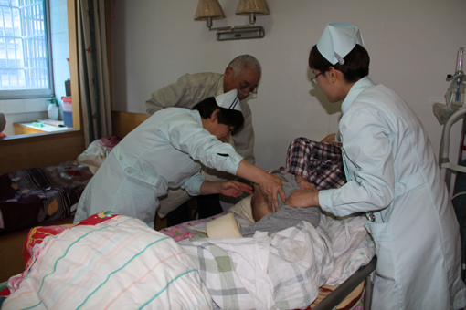 制氧機、氧氣筒、導(dǎo)尿管……這些一般只有醫(yī)院里才可以看得到的設(shè)備,在楊大爺卻一應(yīng)俱全,6年來,楊大爺也從一個企業(yè)退休工人變成了“半個醫(yī)生”,看到此情此景,護(hù)士長們深深敬佩楊大爺對沈婆婆的那份真情。護(hù)士長為沈婆婆測血壓,檢查口腔、皮膚,活動肢體,送上慰問品,并指導(dǎo)楊大爺如何科學(xué)地進(jìn)行鼻飼、口腔護(hù)理、壓瘡預(yù)防和合理營養(yǎng),贈送《壓瘡防治手冊》,以便楊大爺更好的進(jìn)行全面護(hù)理,楊大爺對兩位護(hù)士長的到來表示歡迎和真誠的感謝。(辦公室)