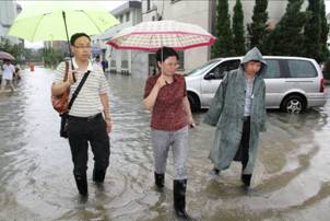 6月18日上午,由于連降大暴雨,我院出現(xiàn)大面積內(nèi)澇現(xiàn)象,暴雨將門診大樓、病房大樓和醫(yī)院入口完全隔開,醫(yī)院門診大樓內(nèi)的醫(yī)生只能和門口的患者“隔水相望”,地面積水高達(dá)20厘米以上。面對(duì)突如其來的洪水,醫(yī)院立即向上級(jí)部門報(bào)告災(zāi)情,迅速啟動(dòng)緊急防洪預(yù)案,院長(zhǎng)張龍君親自到災(zāi)情最緊急的配電房指揮,副市長(zhǎng)方靜、衛(wèi)生局局長(zhǎng)錢宏偉等領(lǐng)導(dǎo)第一時(shí)間趕到現(xiàn)場(chǎng),冒雨擬定排澇搶險(xiǎn)方案。