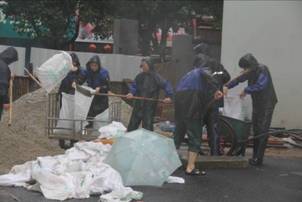 在病房東門,醫(yī)院各科室自發(fā)組織搶險(xiǎn)隊(duì)伍,各病區(qū)科主任帶頭,在十幾分鐘內(nèi)就組織一支五六十人的搶險(xiǎn)隊(duì)伍,他們有的扎袋口、有的扛沙袋、有的堵進(jìn)水口,只要有漏水口就有中醫(yī)院醫(yī)務(wù)人員的身影……